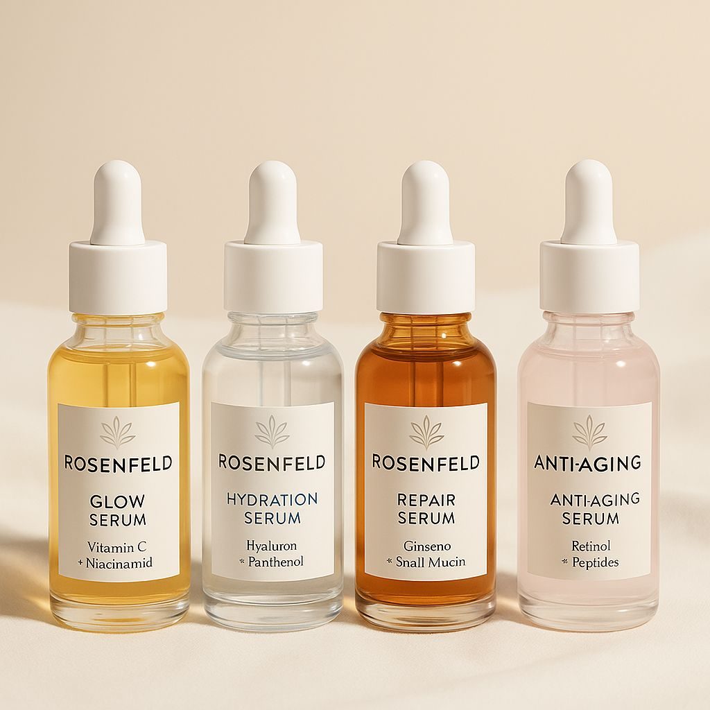 Unsere Rosenfeld Skincare-Linie vereint hochwirksame Inhaltsstoffe mit luxuriösem Design.